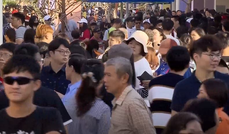 外面排了好幾圈,走道上、美食街、摩天輪、停車場全都客滿,2000個車位的停車場,滿滿的車年輕夫妻推著嬰兒車,停在一公里外得徒步走過去。