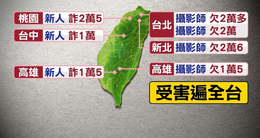 自救會的成員們統計,從北到南都有新人跟攝影師受害,金額從1萬到5萬元不等,其他還沒出面的受害人可能更多,粗估呂姓男子得手至少50萬元跑不掉。