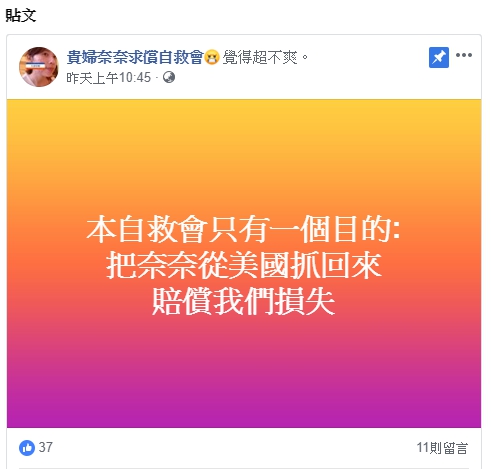 現在還有受害者,在臉書成立「貴婦奈奈求償自救會」,粉絲團大頭照還特別選用這張照片,強調要把奈奈從美國抓回來,賠償大家的損失。