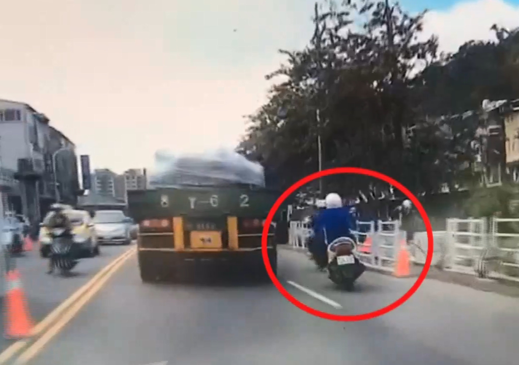 一早10點多,聯結車後方緊跟著2名騎士,這時後方這名騎士加速往前想超車,突然摔車倒地,這一摔被前方聯結車的右後車輪輾過,連命都沒了,但前方騎士跟聯結車卻像是沒事一樣,離開現場。