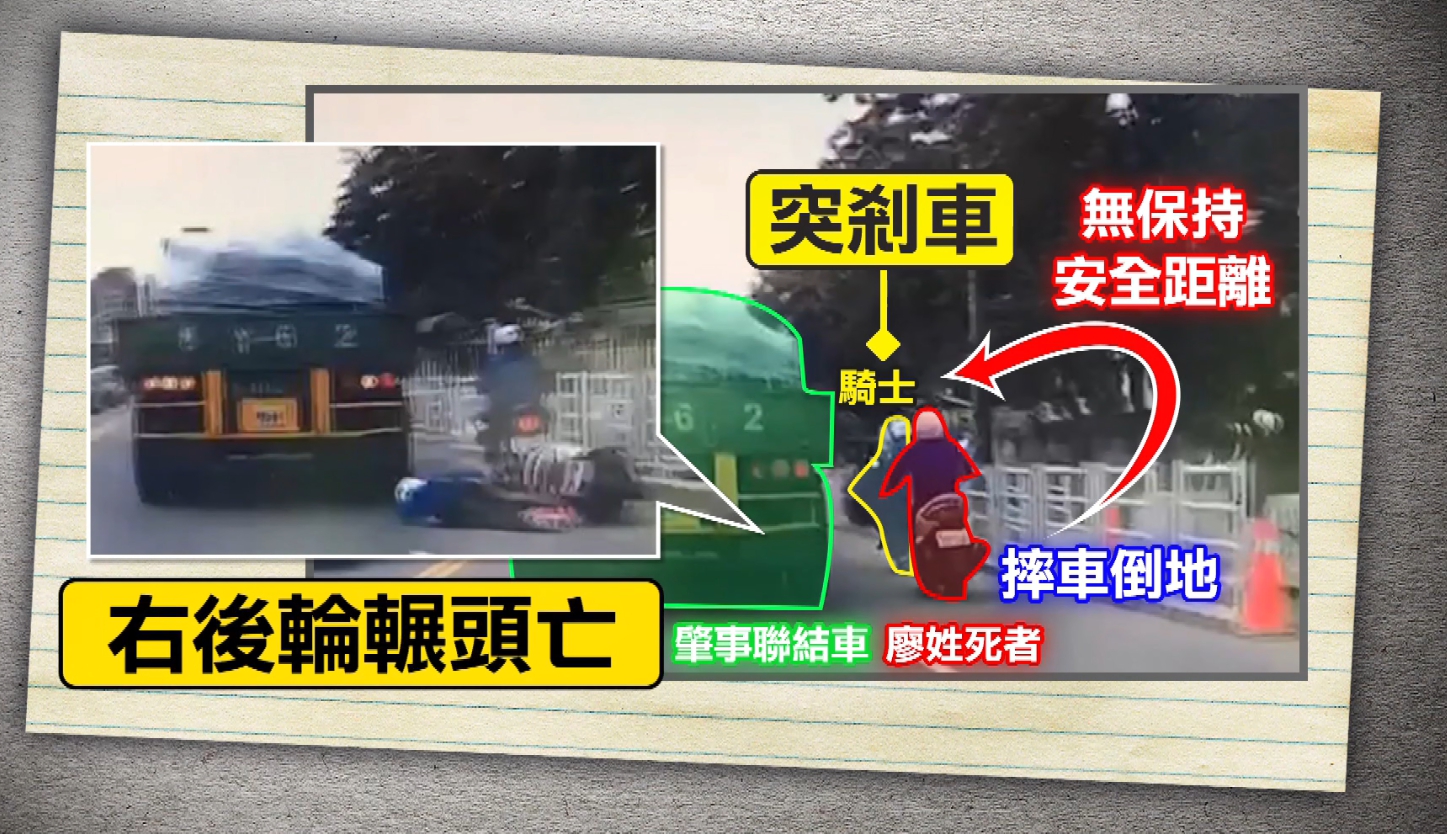 車禍現場,往來大車多,平日車流量大,警方進一步釐清,45歲的廖姓死者沒有保持安全距離,當時前方機車突然剎車,死者急剎導致摔車倒地卻被聯結車輾過頭身亡。