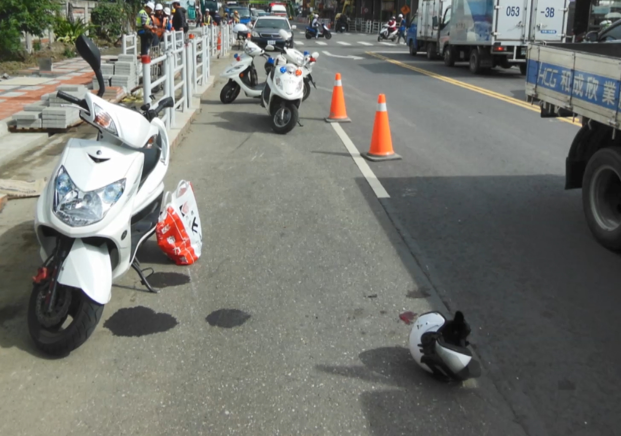 騎士安全帽遺留在現場,當時被聯結車輾過頭部重創,當場沒了生命跡象,送醫搶救仍傷重不治。