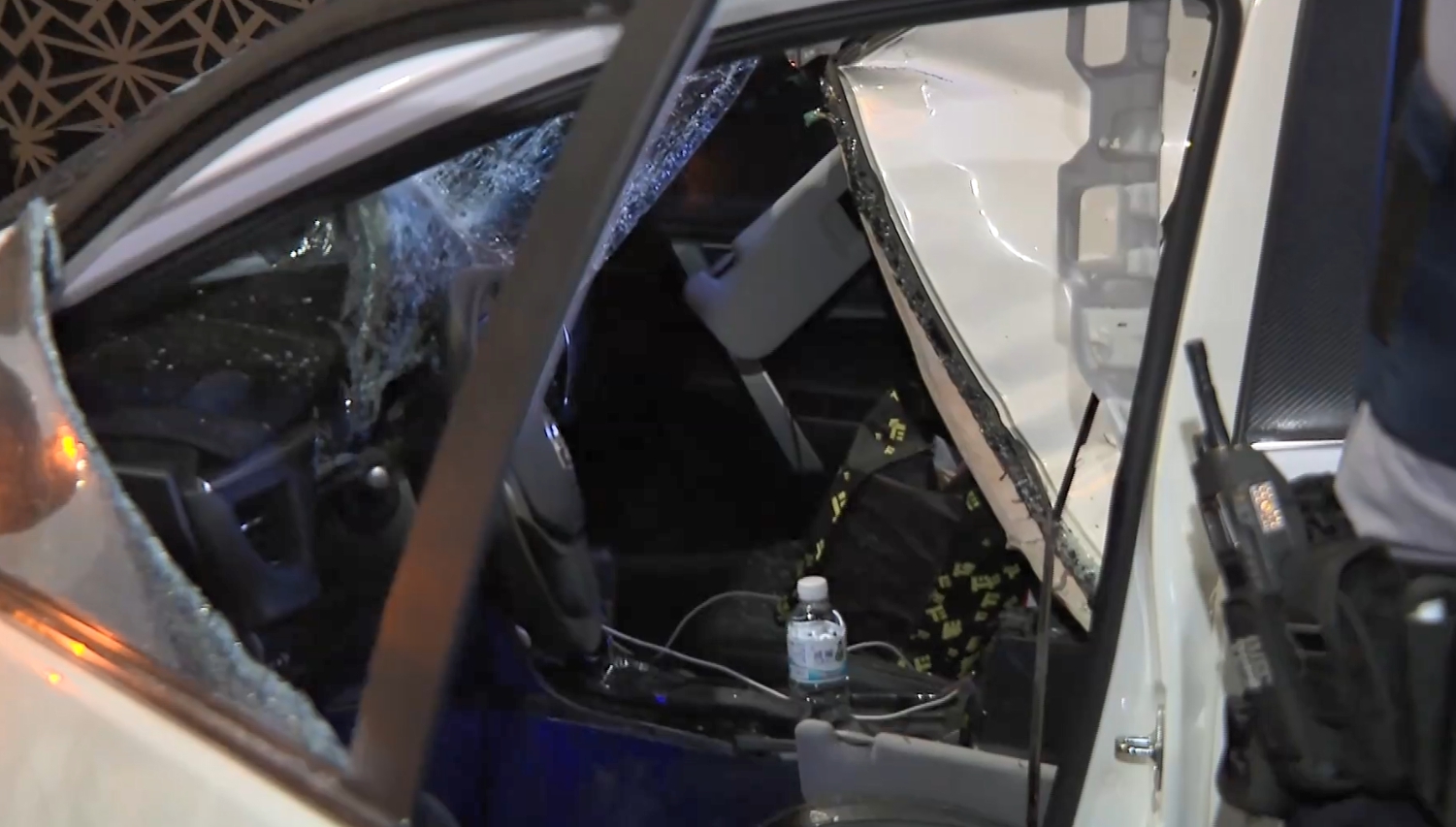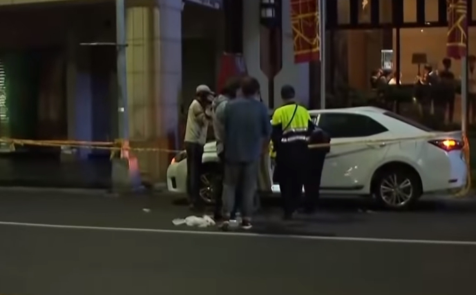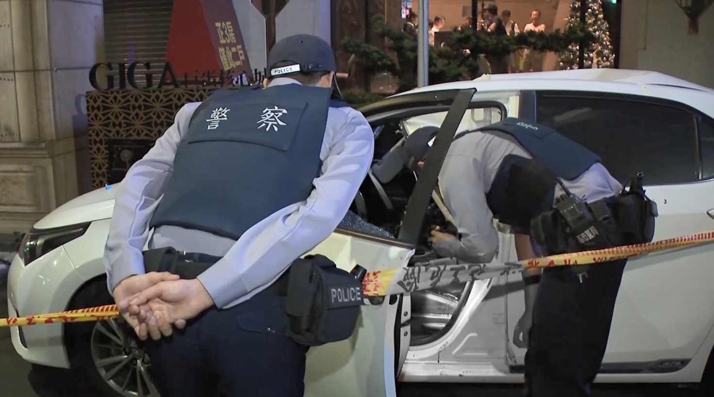 墜樓現場是在文信路這棟大樓的新建案前,凌晨1點多,一名男子突然從高處墜落,不偏不倚就摔在停在大樓前的這輛白色轎車上頭,巨大的撞擊力把車頂和前擋風玻璃處整個撞破,人再衝進轎車裡頭,碰的一聲巨響,讓大家都嚇壞了,轎車車主是這一位在附近上班的女子,出來查看時,整個人都嚇壞了。