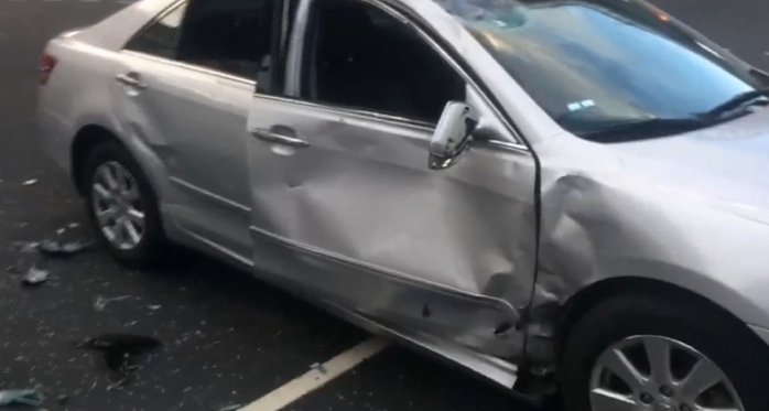 一台銀色轎車行駛在十字路口,準備往左轉,沒想到轉過去之後,右邊一台機車突然撞上,瞬間撞擊,讓機車騎士當場噴飛,回到事故現場看。這台轎車右側,整個車門被撞凹、玻璃破裂,而機車更從車頭到車尾,整個扭曲變形、零件四散,可見撞擊力道有多大。