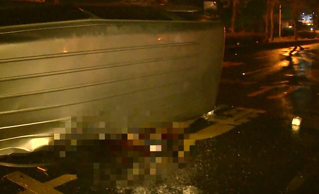 路口監視器拍下,賓士車的車燈從遠處高速開過來,突然車燈劇烈晃動左右偏移。銀色廂型車90度翻倒在路中央,車道上灑滿汽車零件碎片,以及從車內噴飛出來的東西,一大灘血跡從車底流出,場面十分驚悚,畫面轉到路旁白色賓士車車頭全毀面目全非,大量零件噴飛整輛車滑到路旁,只剩一盞車燈不斷閃爍。