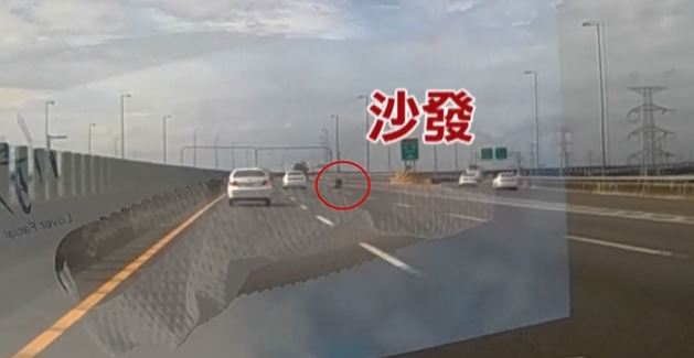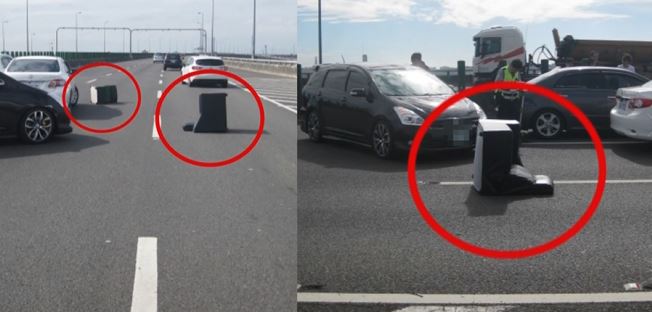 駕駛從國道中線切進內線一路順暢,一邊跟車上乘客聊天,突然前方大車變換車道,兩線車道的轎車都放慢車速,原來是發現前方有掉落物。