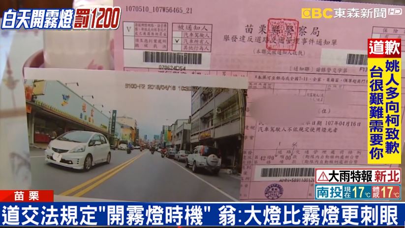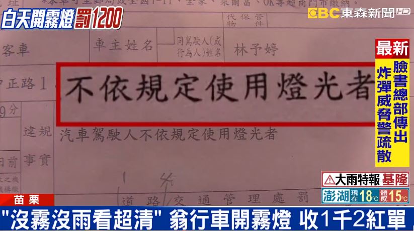 苗栗有一名75歲劉姓老翁,收到一張紅單,他先是看了照片,覺得車子開在路上好端端的,也沒有超線、闖紅燈,但仔細看了罰單才發現,因為大白天的行車開霧燈,被其他人拍照檢舉,結果因此損失1200塊錢,劉姓老翁覺得不合理,要大家評評理。