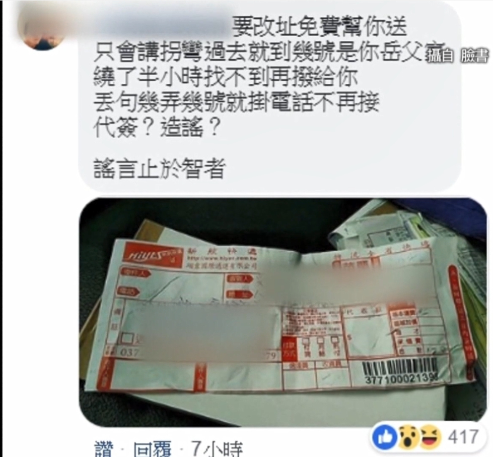 兩人越說火氣越大,司機也上網親上火線回應,收件人當時要求改地址免費幫他送,但卻沒有給明確地址,繞了半個小時遲遲找不到再打電給收件人,卻遭對方掛電話。