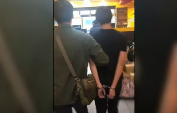 身穿黑色上衣,手被戴上手銬,一旁員警陪同從網咖走出去的21歲,葉姓男子,為涉嫌攻擊賣場店員遭警方緝捕到案。