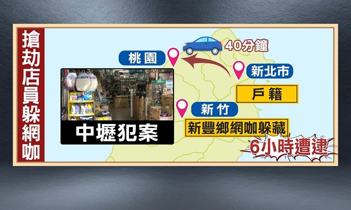 桃園警方獲報後,調閱店內和街上,一共上百隻監視器 ,逐一過濾發現葉姓男子的戶籍其實在新北市,卻跑到桃園中壢的大賣場搶劫店員,隨後跑到車程40分鐘的新竹新豐鄉網咖躲藏,不到6小時遭警方逮補。