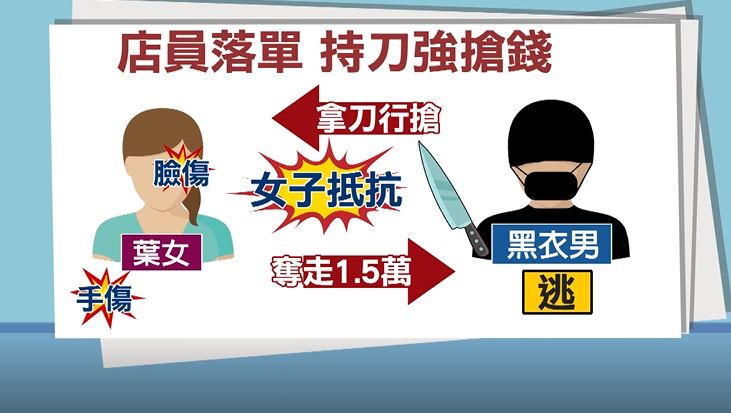 新北市一名21歲男子到中壢一家賣場,發現裡面只有一名女店員,嫌犯缺錢心生歹念,趁店員落單亮刀行搶,女店員手部和臉部都被割傷,嫌犯搶走1萬5千元逃逸,警方六小時內在新竹的網咖逮捕嫌犯。