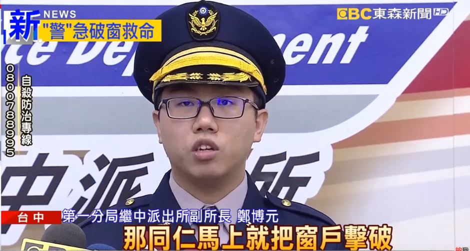 第一分局繼中派出所副所長鄭博元:「當時男子的重心,其實就有點要被女子拖下去,那同仁馬上就把窗戶擊破,把人救下來,過程應不到3分鐘」。
