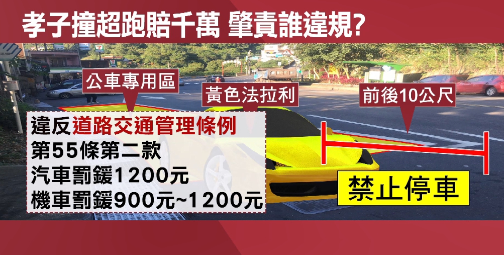 黃色法拉利停在公車專用區前方,已違反「道路交通管理條例」第55條第二款,警方除了對違規跑車駕駛開罰外,也將違規事實列入,這起交通事故相關肇責調查中,還原當時車禍發生,16號清晨5點多,林姓駕駛開廂型車行經石碇區雙溪口,淡蘭吊橋停車場外,這邊有公車站牌、道路縮減,駕駛又恍神,撞到停在公廁前的法拉利後,再追撞前方白色法拉利跟藍色法拉利,其中白色法拉利受損最嚴重,3輛跑車賠償費破千萬。