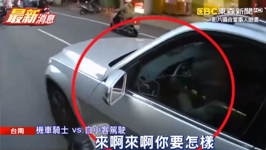 這到底誰對誰錯?台南一名自小客駕駛和機車騎士在馬路中央大吵,機車騎士指自小客危險駕駛,而自小客則批機車騎士,明明內側路面標示禁行機車,他還違規硬騎,騎士把畫面PO網要網友評理,而警方則表示,騎士確實違規了,因為禁行機車的車道是不能騎車的。