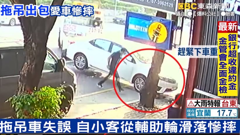 違規停車被拖吊合情合理,但這名拖吊車業者正在拖吊車子的過程中,輔助輪不慎脫落,導致自小客車頭重摔,民眾把影片PO上網,要提醒車主領車後最後去做檢查,拖吊車業者也表示,一旦發現車子受損,也將會全權負責。