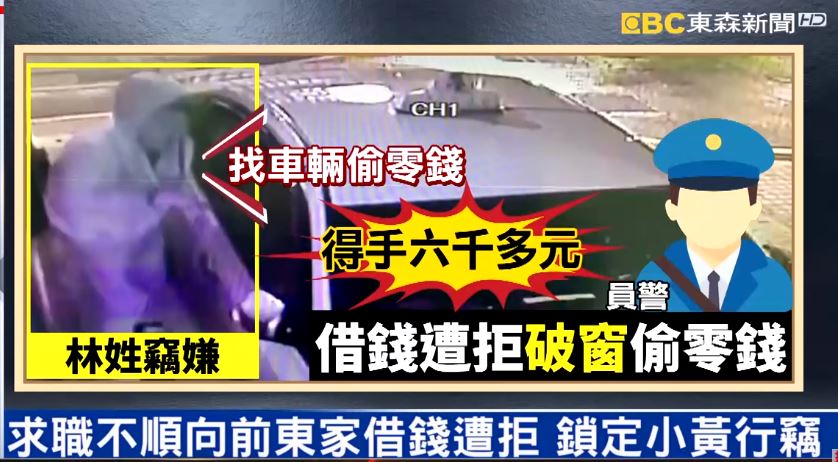 東森新聞記者李家名:「當時這名男子因為缺錢花用,所以他專挑停在路邊的汽車,先查看裡頭有沒有放置零錢,接著就用工具破窗,竊取裡頭的財物,總共5台車受害,得手金額超過六千元。」