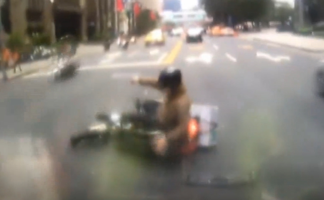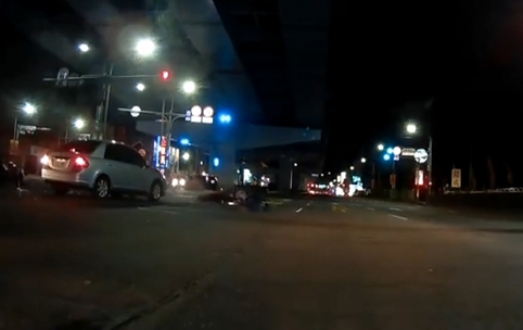 紅綠燈轉為綠燈,陳姓機車騎士催緊油門,只是才騎過一半,被右邊闖紅燈轎車直接撞上,畫面天旋地轉,騎士慘遭擊落。從後方轎車行車紀錄器來看,正當所有車輛都在停等紅綠燈時,一輛銀色小轎車卻沒停下來,他撞到兩輛橫向綠燈的直行機車,發出巨大碰撞聲,被撞的騎士在地面滾了2、3圈,躺在地上不斷哀嚎。