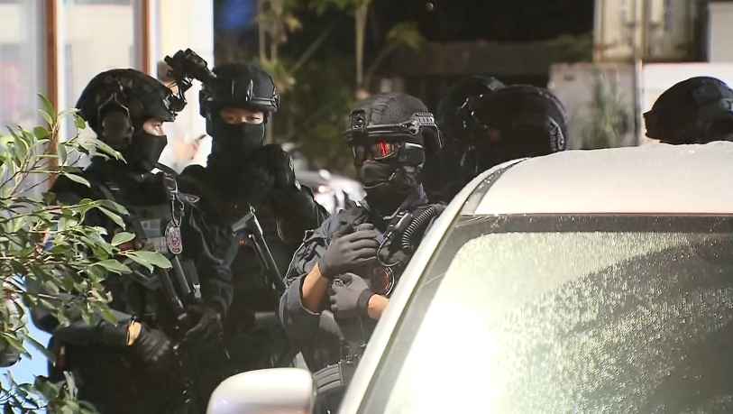 時間回到前一晚,現場拉起封鎖線,氣氛緊張,大批的警力以及特勤人員,戴著頭盔,拿著槍枝、盾牌,在新莊地區進行圍捕,因為有一名身穿紅衣的男子,左手持槍到處亂竄,甚至看到警方出現還持槍拒捕,行徑太囂張,嚇壞附近的住戶。