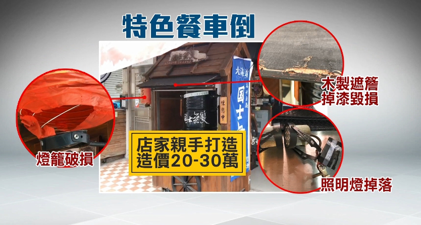 兩人反過頭來,要店家賠償機車維修費用。有網友看監視器畫面,男子疑似想幫女生綁鞋帶,但也有人說,是要幫女子拍照,悲劇才因此發生。男子被餐車稍微壓到,而女生很幸運,從縫隙穿過去沒有受傷。日式料理店老闆娘:「就坐在這裡,因為這地有點傾斜,應該是坐在這裡,腳都起來了。」被弄倒的餐車,已經被扶起來,不過遮簷和燈籠破損,還有照明燈也掉了下來,這台餐車由店家親自設計,造價2、30萬。