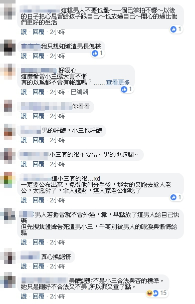 渣男渣女行徑,宛如8點檔世間情戲碼,讓眾網友拳頭硬了,紛紛在臉書《爆料公社》痛罵「小三固然不對,求公布男的!一個都別放過」、「男的要公布啦!讓他們惺惺相惜才不會再禍害其他人」、「這種男人不要也罷,一個巴掌拍不響,以後的日子把心思留給孩子跟自己,也放過自己,開心的過比他們更好的生活」、「那種渣渣…送她也好!物以類聚!妳值得更好,祝福妳2019有嶄新、美好的未來」、「人賤自有天收,希望妳能好好過自己的生活,把孩子帶好就好了,加油」、「小三是地球上最強的蟑螂」。
