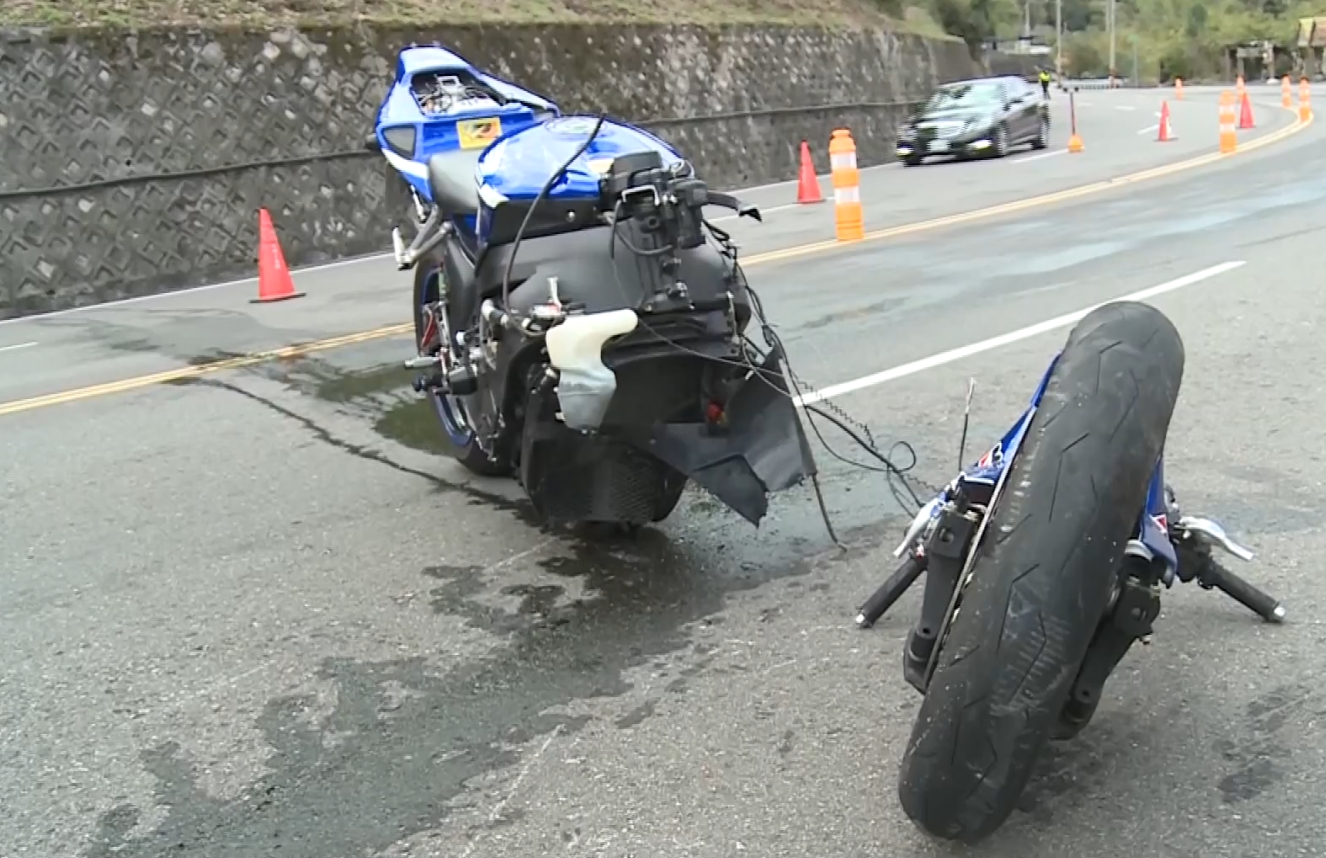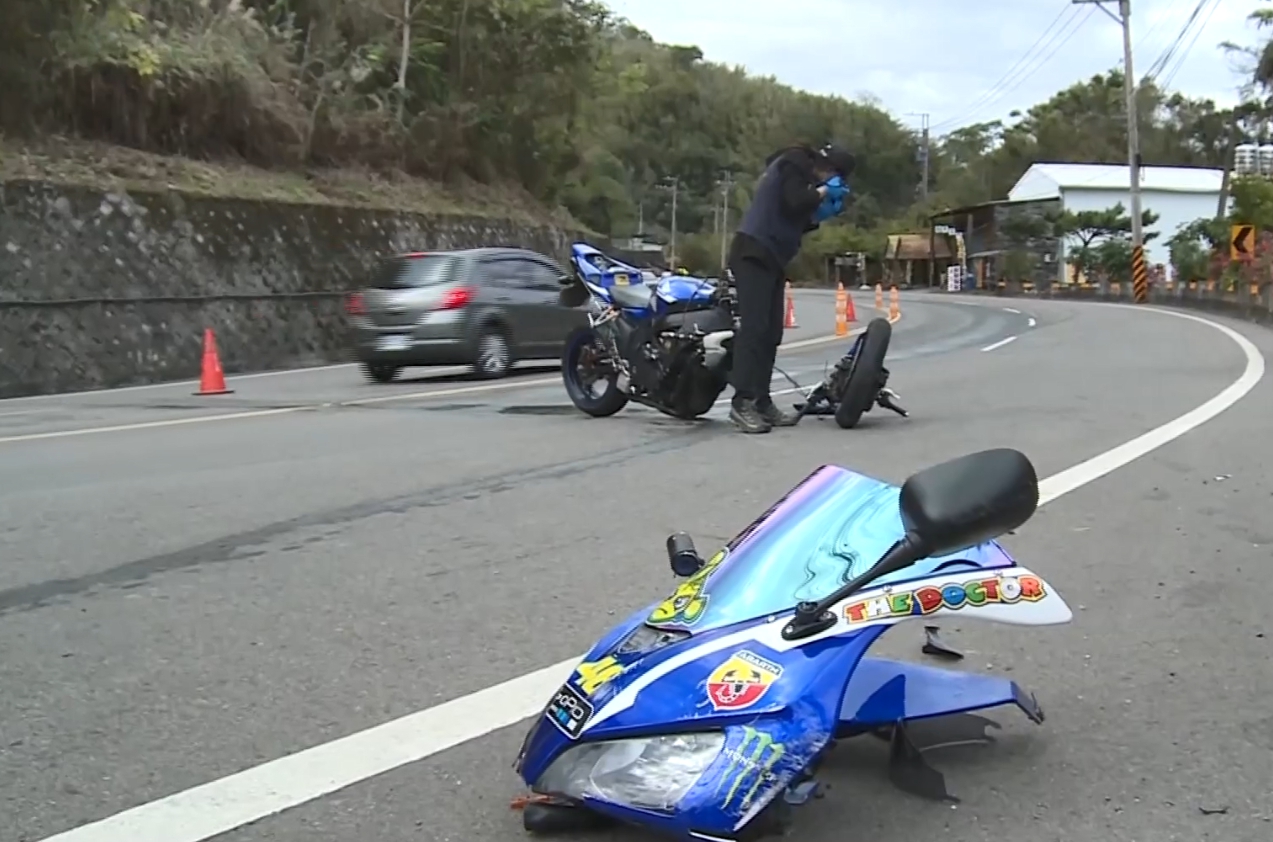 他的藍色重機因為撞擊力道猛烈,導致車身跟車頭分離,地上還流大量油漬,連他的安全帽和護具都噴到路邊,王姓騎士早上9點多騎乘重機,行經台三線苗栗三灣路段,結果在這處彎道突然摔車,騎士連人帶車撞上路邊廢輪胎,再衝撞電線桿,撞擊力道之大,重機又被彈回車道上。