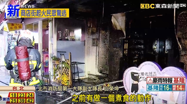 北市消防局第一大隊副大隊長白榮坤:「現場人員表示,他們是看到從他們店家的後側,有一個起火現象,在起火之前,他們表示有之前有做一個煮食的動作。」