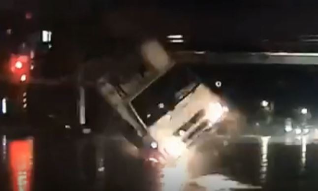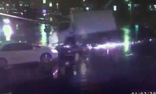 十字路口前車來車往,天空下著綿綿細雨,轎車準備左轉,但對向的貨車卻突然失控,整台車側翻只用兩顆輪子前進迎面撞來,這一撞不得了,根本像打保齡球,等待左轉的一整排車通通撞成一團,透過監視器畫面來看,這台貨車一路失控打滑而來,地面濺起火光,把第一輛等待的車子都給撞出鏡頭外。