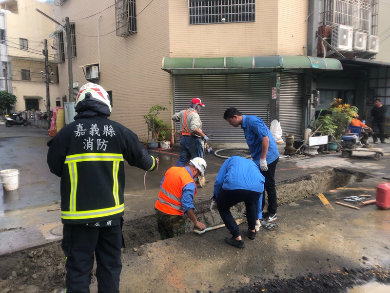 嘉義縣消防局於上午8時49分接獲民眾報案,指民雄鄉福樂村埤角地區發生瓦斯管線破裂事件,第二大隊雙福分隊長顏新訓到場回報,現場為自來水公司施工時,不慎挖破瓦斯管線,洩漏量大。