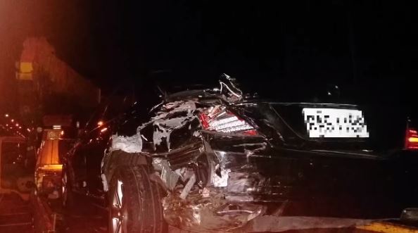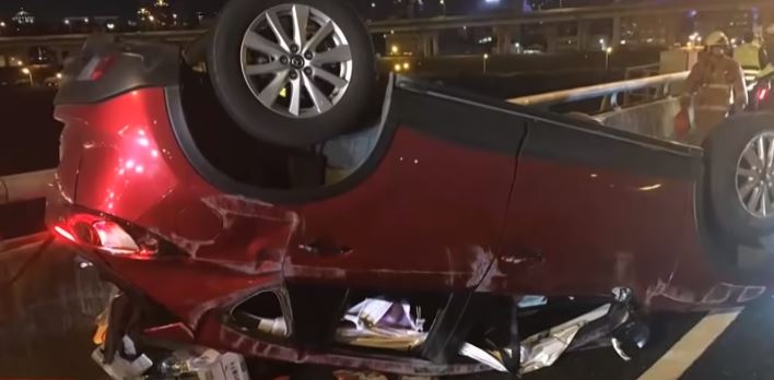 肇事的紅色轎車,撞人後反而四輪朝天,車子毀損嚴重,不是板金近乎全毀,就是擋風玻璃碎裂,讓人看得怵目驚心,甚至車內物品也散了一地,至於被撞的賓士車,左後板金也被撞凹一個洞,幸好2名駕駛幸運的毫髮無傷。