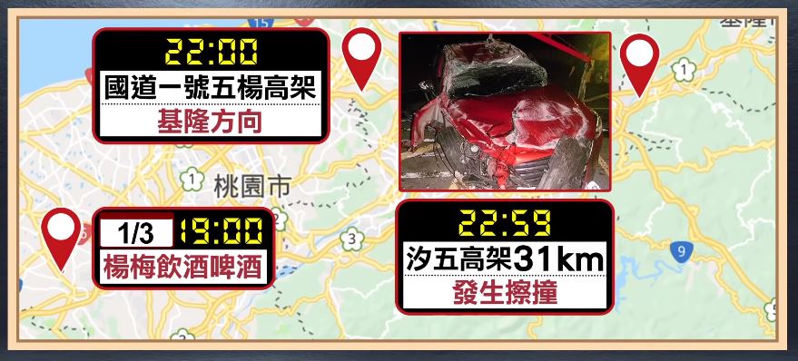 整起車禍事件,就發生在3日晚間10點多,國道一號汐五高架北上31公里處,警消清查,肇事的蔡姓男子先在晚間7點多,在桃園楊梅跟朋友喝啤酒,晚間10點覺得自己可以上路了,行走五楊高架,最後一小時內,就在31公里處發生擦撞,警方到場後,果然嗅到不正常的味道。