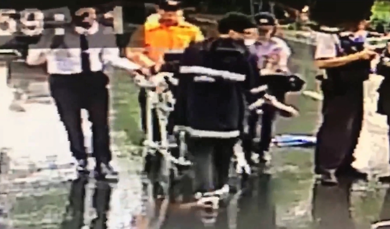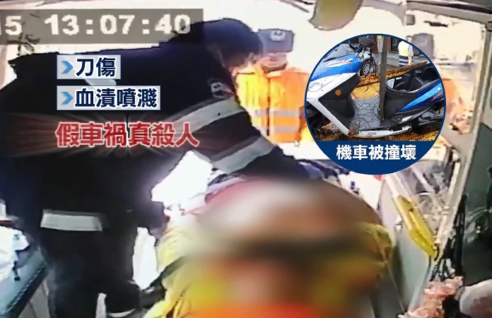 監視畫面中,一輛白色轎車高速開了過來,直接衝撞機車,把騎士直接撞飛,這不是車禍意外而是謀殺,因為就在騎士掙扎爬起後,轎車駕駛隨後下車,持木工刀再朝受傷倒地的林姓騎士胸部猛刺,救護人員雖然趕到現場,進行CPR急救,但林姓騎士仍然傷重不治。