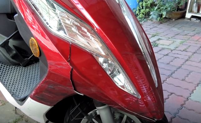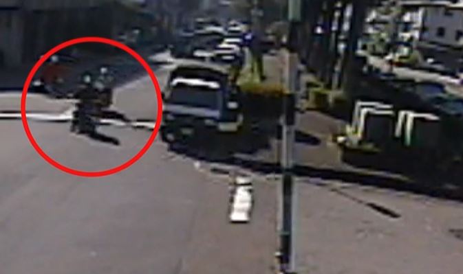 十字路口車多,一輛機車突然右轉,撞上女騎士的車,兩車相撞路口倒成一團,沒想到肇事騎士竟然當沒事一樣,牽起機車後直接騎走,女騎士很生氣,不只全身痛,紅色機車也被撞到裂開,但肇事騎士跑得不見蹤影,女子來不及記下車號於是報警處理,結果警方調閱監視器,以車號追人查出肇事79歲黃姓騎士。