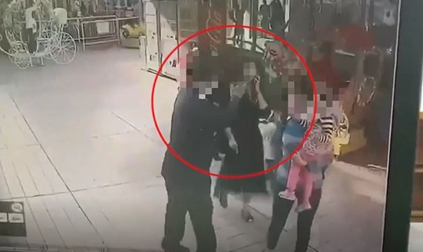 百貨公司頂樓遊樂場的監視畫面,看到這對夫婦抱著一個小女孩正要離開,後方追來一名母親,身邊還帶著2個小孩上前和男子理論,只見抱小孩的夫婦轉身就走,而雙方先前是因為,玩這個旋轉木馬發生口角,投訴的辜小姐說她明明看到木馬有空位,叫9歲的兒子去坐後卻遭到男子驅趕還爆粗口。