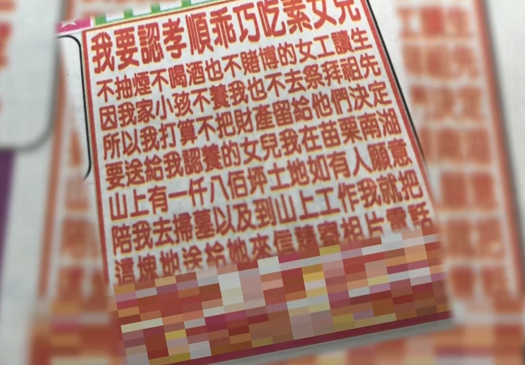 七十歲的謝老先生,去年八月曾在報紙上刊登廣告要認乾女兒,條件是孝順乖巧、要吃素,除了不抽菸、喝酒和賭博外,還要陪他到山上幫祖先掃墓,如果確定認下的乾女兒 ,將會把苗栗山區一千八百坪、價值千萬的土地送給她。