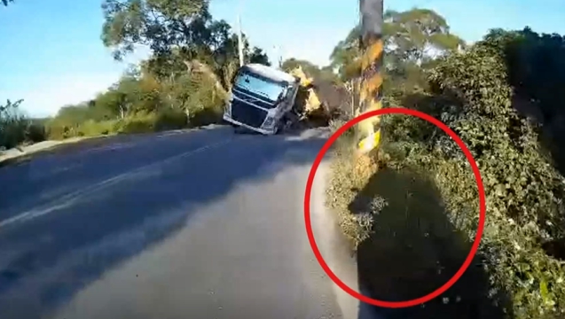 機車好端端騎在山路,沒想到下一秒,砂石車突然整台車翻倒在對向車道,短短2秒鐘的時間,機車不管是變換車道還是轉開方向,都已經來不及,行車記錄器畫面中斷,但騎士人呢,他還好嗎?