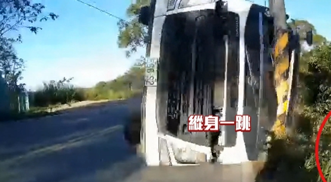 驚險畫面放慢動作再看一次,砂石車轉彎時,車身晃了晃,後車斗先翻倒後,車頭也被拉扯在地,上百公斤的砂石車,迎面撞了過來,但仔細看旁邊影子,騎士似乎早有準備,機車明顯放慢速度,穩住重心後,騎士往路邊縱身一跳,千鈞一髮之際,機車被撞成廢鐵,騎士幸運撿回一命。