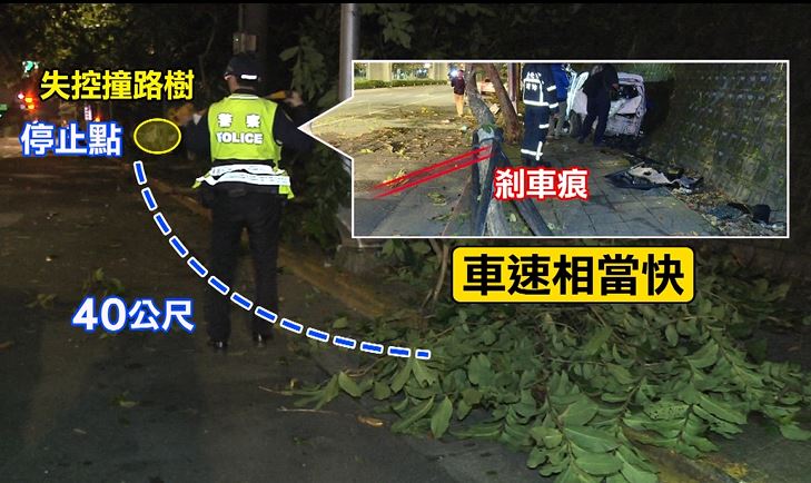 22歲歲盧姓駕駛,行經成功路五段時,疑似在過彎時失控撞上人行道。當時車子偏離車道,失控先撞路樹,再一路往前衝,從地上剎車痕到車輛最後停止的位子居然有40公尺,可見當時車速相當快 。