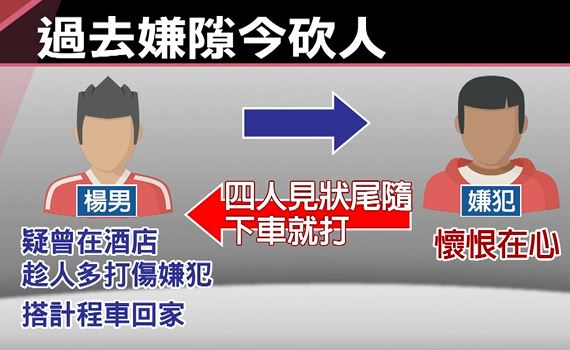 附近民眾原以為他是騎機車時和貨車有行車糾紛,沒想到警方調查發現,傷者和砍人惡煞原本就認識,過去楊姓男子曾在酒店時趁人多打傷嫌犯,這次凌晨搭計程車回家被嫌犯發現,4惡煞沿路尾隨,看他下車就動手圍毆。
