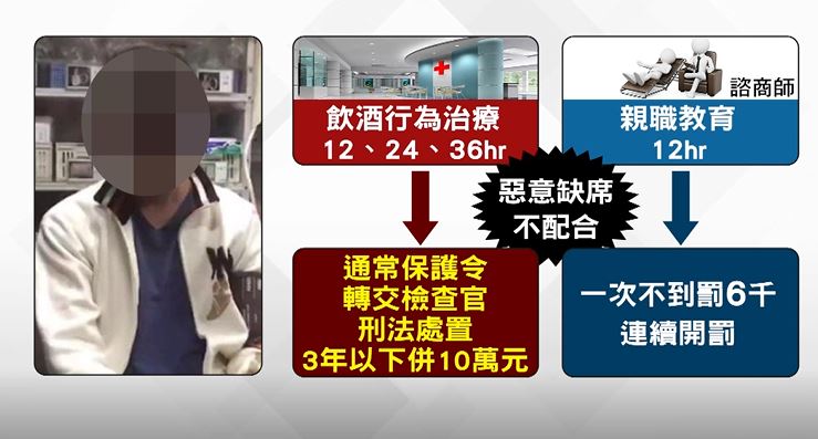 男子酒後失控,行為暴力必須是到醫院進行飲酒行為治療,一般而言分成12、24或36小時,另一項是諮商師的親職教育課程,12次1次一小時,但如果當事人惡意缺席,或是態度不配合,家防中心也有應對之道,如果是拒絕戒酒,那將轉達檢察官以刑法處置,3年以下併10萬元罰金,如果是親職課程不到,缺課一次開罰6千塊,另外將視男子情況,持續追蹤時間不等,未來社會局還會安排,親子夫妻關係 ,還有未成年子女監督服務等課程,矯正男子酒後暴力失控行為。