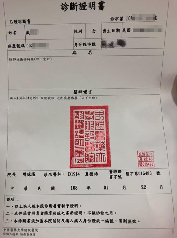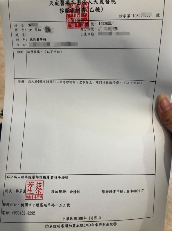 ▼Didi提出驗傷證明。(圖/翻攝自當事人臉書)