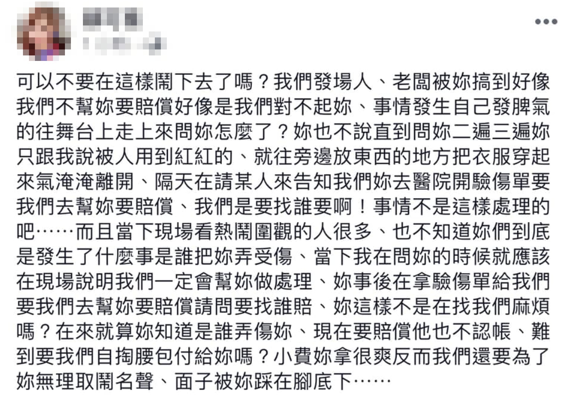 本以為事情告一段落,沒想到主持人隔天竟在網路上發文,責怪她當下不說,隔天才傳驗傷報告,「自己賺小費很爽,後面才來鬧」,讓Didi氣壞控訴,表演結束還硬留她在那邊,甚至被醉漢弄成這樣,且自己根本只拿到100元小費,接下來3到6個月都無法工作,根本得不償失,現在只是想要醫藥費,並不是在無理取鬧。