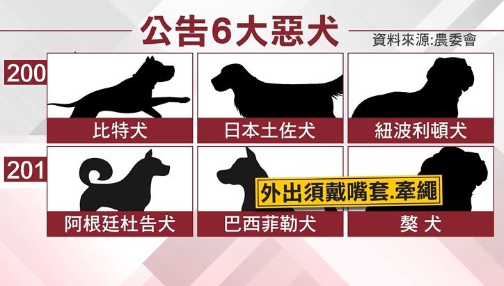 為保護人也保護小寵物,早在2001年農委會就優先將比特犬、日本土佐犬、紐波利頓犬列為危險犬種,2015年新增阿根廷杜告犬、巴西菲勒犬、獒犬,總計有6種狗被列為危險犬種,外出須戴嘴套及牽繩。
