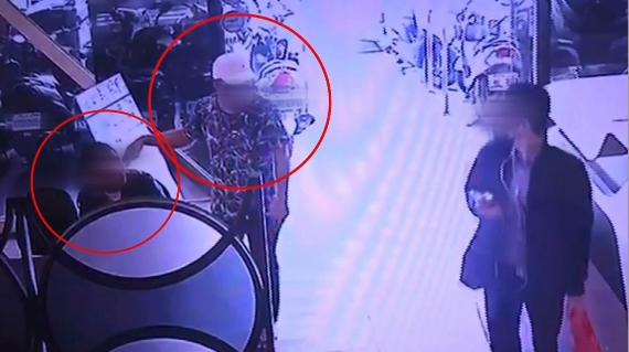 這家電子遊藝場發生持搶打人的事件,店家的監視畫面擷取的照片中,看到其中一名嫌犯,持槍抵住坐在店門口男員工的頭部,控制他不能動,其間有客進入遊藝場,還不知道發生了什麼事,一路的往裡面的機台走去。