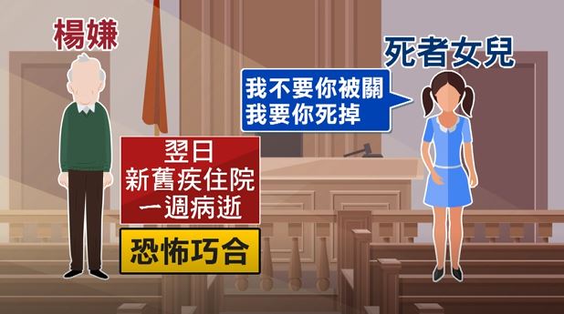 楊姓老翁後來幸運被救回一條命,法院開庭時,死者女兒怒斥,希望嫌犯不要被關要他死掉。沒想到隔天,嫌犯因為喝農藥,加上肺部舊疾住院,一週後病逝,讓不少人大呼,這詛咒成真的巧合,實在太可怕。