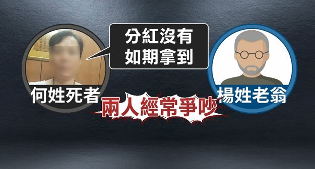 何姓婦人,多年前喪偶,之後認識同居人楊姓老翁,把自己積蓄都交給他,投資美國藥廠生意,但原本說好的紅利,沒辦法照約定給,兩人開始爭吵,最後釀成殺人悲劇舊。