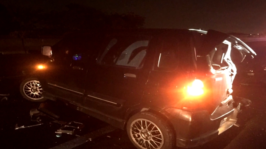 國道一號27號凌晨發生重大連環車禍,6部車追撞在一塊,其中這部黑色轎車,車尾因為追撞擠壓變形,玻璃沒一處完好,坐在副駕駛座的賴姓女子傷重不治。