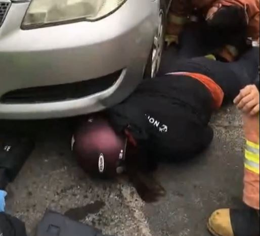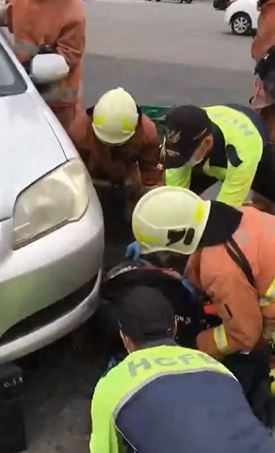 7、8名消防員檢查女子傷勢,確認沒有大礙再分攤施力合力抬車,被壓在車下的蔡姓女騎士終於被搶救出來,送醫急救後發現他全身多處擦傷,雖然手被壓在車輪底下幸好沒骨折是不幸中的大幸。