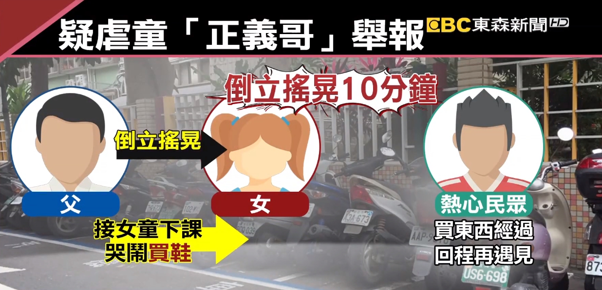 30號晚上台北市信義區的小巷子,女童哭喊求饒,沈先生擔心虐童再發生,立刻制止並報警,警方調查,父親去接女童放學,但女童哭鬧要買新鞋子,無法制止,爸爸氣得抓住她的腳踝,將她倒過來,懸空搖晃,剛好沈先生去買東西經過,以為只是懲罰一下,回程又再看到,這才驚覺原來女童被倒立搖晃10分鐘。