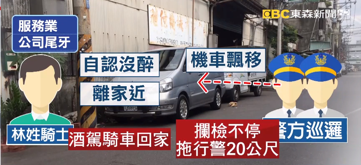 從事服務業的43歲林姓騎士,剛參加完公司尾牙,酒酣耳熱後,想說沒有很醉,家也在附近,貪圖方便就危險騎車回家,誰知剛好遇上警方巡邏,被發現機車飄移不定,攔車盤查還拒檢逃逸,事發的巷弄,路邊停了許多轎車,剛好因為廂型車很大台,騎士異想天開以為車身高度可以幫他躲開員警,結果馬上被抓。