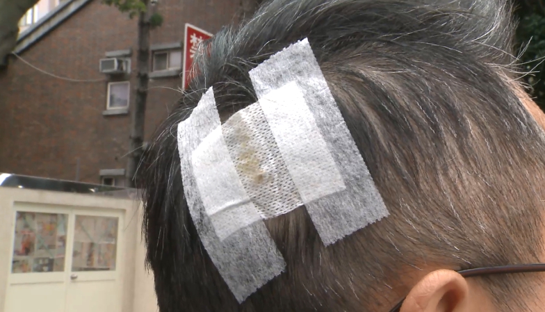 頭上大大的傷口用紗布包紮著,曹姓男子控訴,自己為了揭弊卻遭到里長先生毆打,第一時間《東森新聞》求證,里長丈夫翁先生矢口否認。